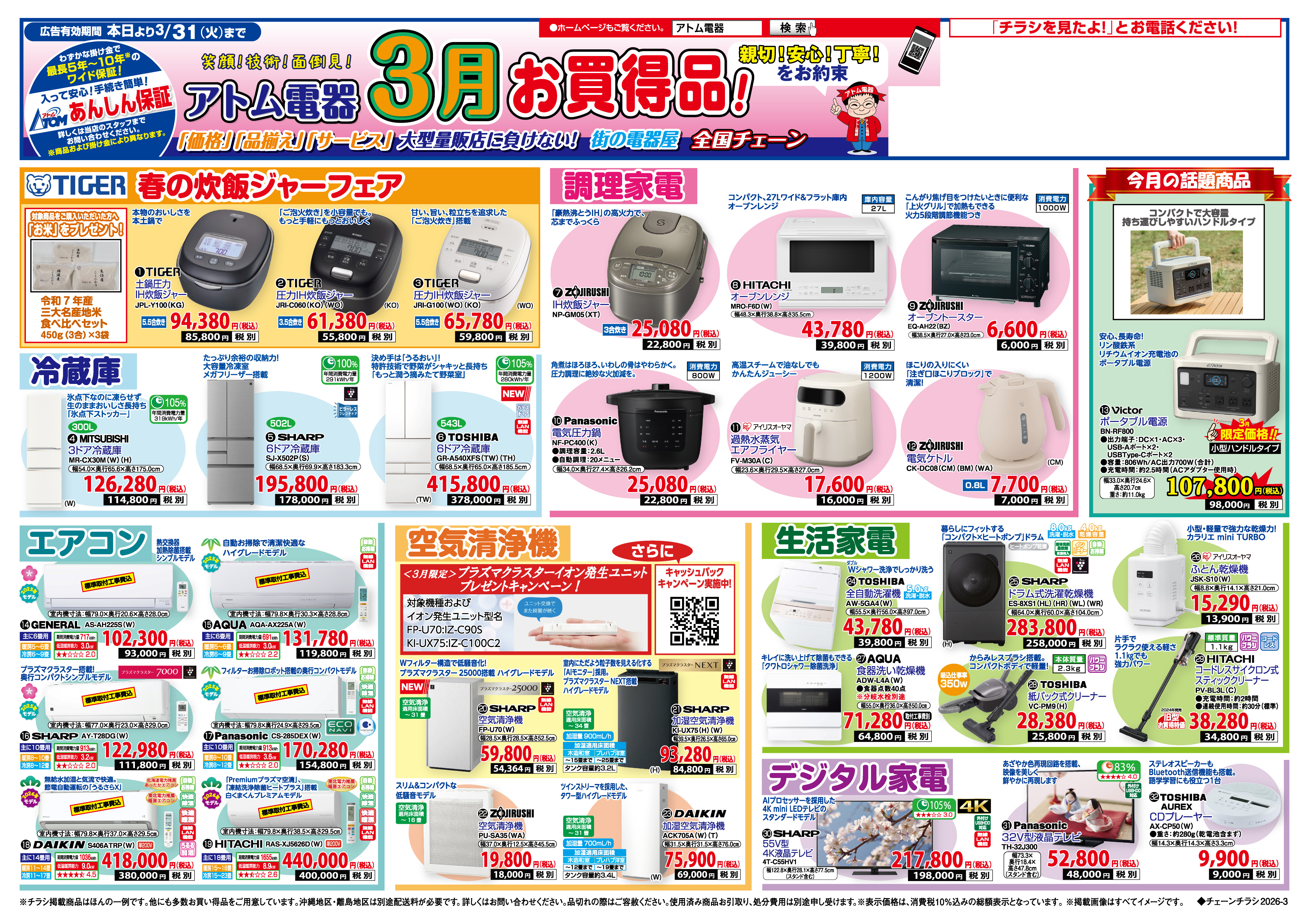 | 当店は、アトム電器チェーンの特徴でもある「まちの電器屋」と「家電量販店」の長所を兼ね備えたお店です。静岡市清水区周辺にお住まいの皆様に寄り添い安心、便利な暮らしをお手伝い致します。家電販売・配送・設置・修理・取扱説明・各種工事、他各種サービスも取り扱っております。 |